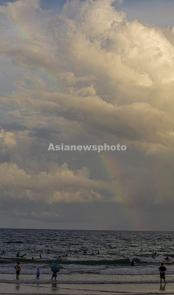 图片说明:7月14日,在海南万宁日月湾,彩虹出现在海边。