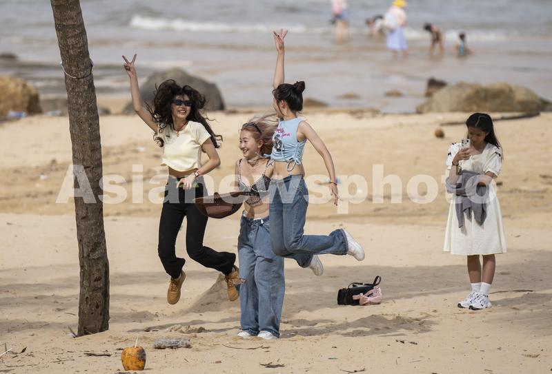图片说明:7月14日,在海南万宁日月湾,游客拍创意照。