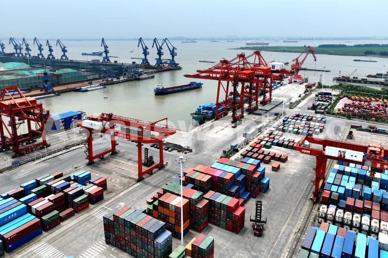 2022年7月15日,在位于江苏省如皋市长江镇境内的如皋港苏中国际码头,机械进行吊装作业,作业区呈现一片繁忙景象。