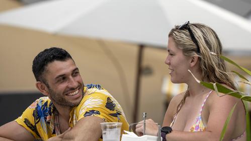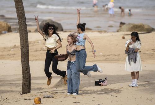 图片说明:7月14日,在海南万宁日月湾,游客在浪尖跳跃、冲刺,享受假日时光。