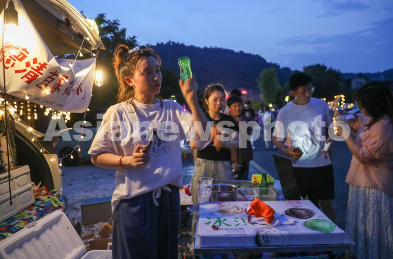 图片说明:2022年7月15日,浙江省湖州市德清县下渚湖街道二都景区“后备箱夜市”登场,吸引了众多市民游客光顾、选购。