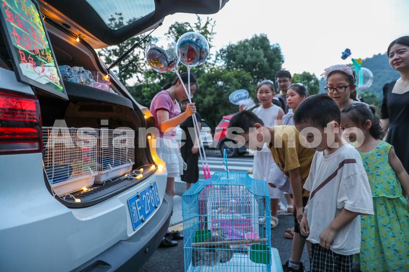 图片说明:2022年7月15日,浙江省湖州市德清县下渚湖街道二都景区“后备箱夜市”登场,吸引了众多市民游客光顾、选购。