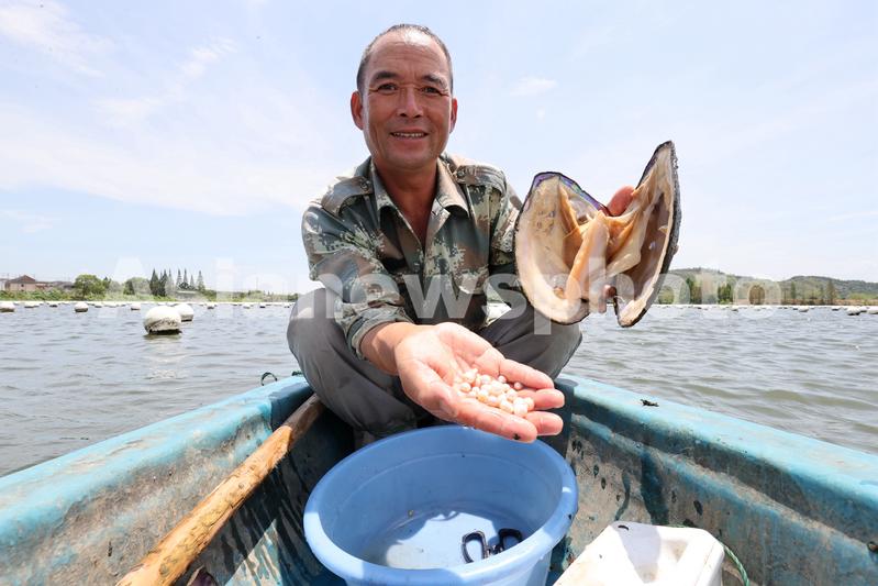 2022年7月20日,在浙江省湖州市德清县阜溪街道龙胜村小山漾淡水珍珠养殖基地,,养殖户在采收珍珠蚌。
