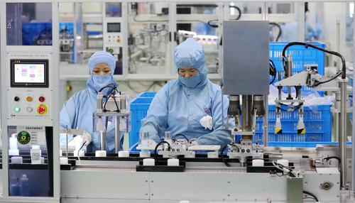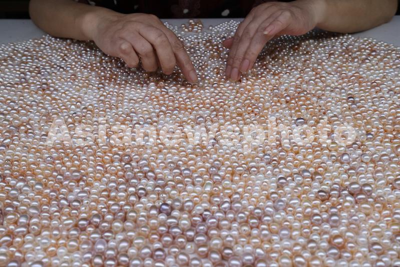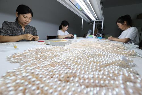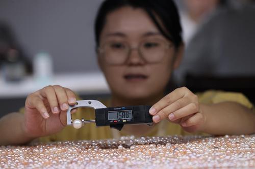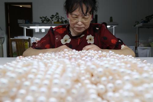 2022年7月20日,浙江省湖州莫干山高新区一家珍珠生产企业的工人在车间内分拣珍珠。