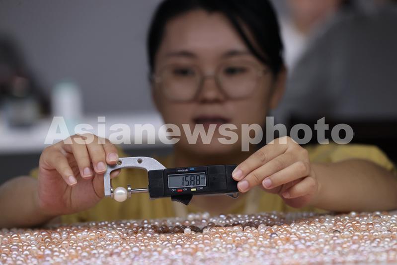 2022年7月20日,浙江省湖州莫干山高新区一家珍珠生产企业的工人在测量珍珠尺寸。