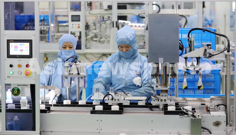 2022年7月20日,浙江省湖州莫干山高新区一家珍珠生产企业的工人在化妆品生产线上忙碌。