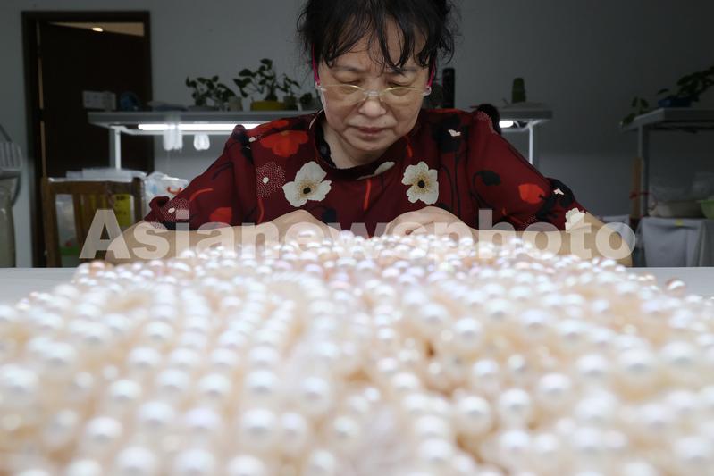 2022年7月20日,浙江省湖州莫干山高新区一家珍珠生产企业的工人在车间内分拣珍珠。