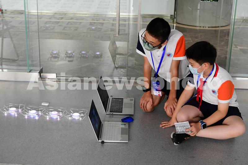 2022年7月21日,第六届全国青少年无人机大赛(浙江赛区)在金华市金华之光文化广场举行,选手们正在操作无人机参赛。