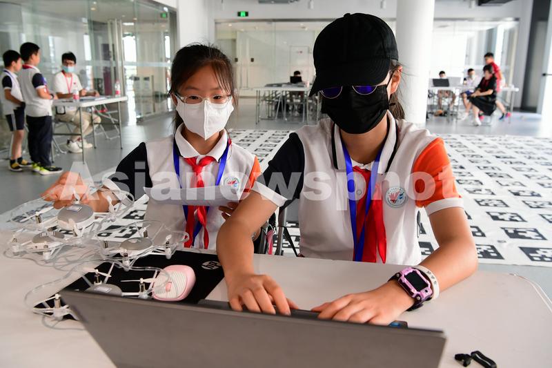 2022年7月21日,第六届全国青少年无人机大赛(浙江赛区)在金华市金华之光文化广场举行,参赛选手们正在比赛现场编程。