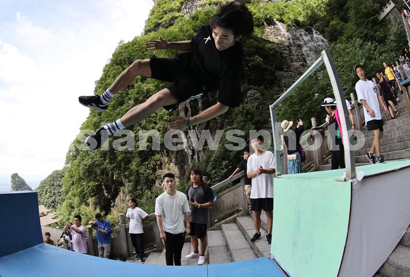 2022年7月22日,参加张家界天门山“云纵天梯”跑酷大赛的选手在赛道进行试跑热身。7月23日-24如,这场高水平跑酷赛事将在湖南张家界天门山景区举行。届时,64名国内优秀跑酷运动员和5名女子外卡组选手,将齐聚天门山标志性景观999级“天梯”,在狭窄陡峭的超长赛道上同场竞技。