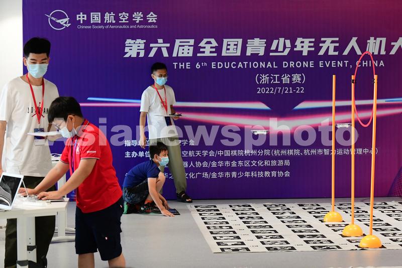 2022年7月21日,第六届全国青少年无人机大赛(浙江赛区)在金华市金华之光文化广场举行,选手们正在操作无人机参赛。