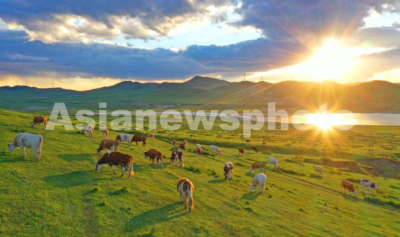 图片说明:2022年7月21日,内蒙古通辽市科尔沁大草原满目青翠,转动的风车、天空中飘动的白云与草地间的牛羊和马群构成一幅夏日美丽画卷。