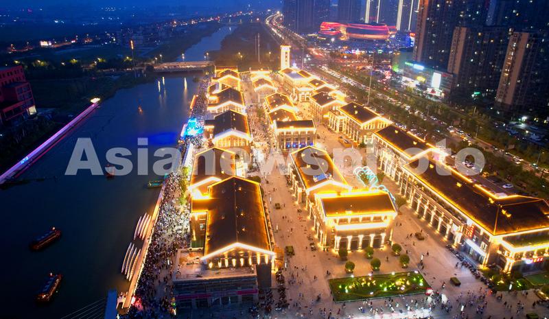2022年7月22日晚,连云港市海州区盐河驿时尚中心,众多市民在盐河驿水上游览项目启动仪式现场游览、参观。今年以来,江苏连云港市海州区大力推进夜间文旅发展战略,文创夜集、古玩夜集、美食夜集、百货夜集、淮海戏剧场、百姓大舞台等让市民夜间生活有了更多新的体验,多元化的夜间消费市场再度活跃,不仅促进了经济提质升级,还为城市增添了新的活力。