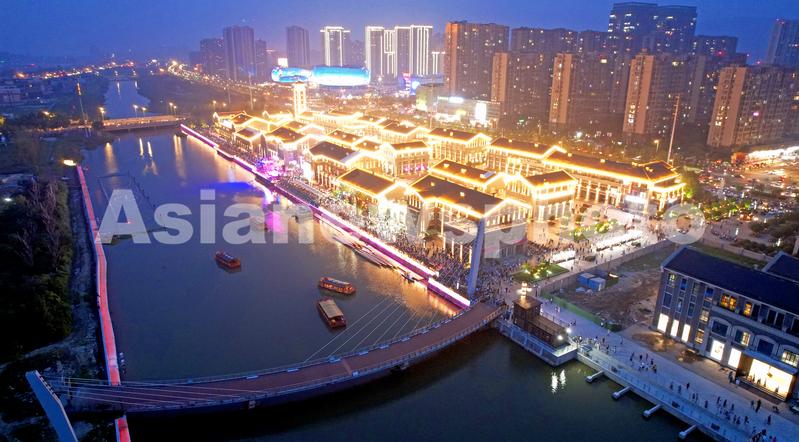 2022年7月22日晚,连云港市海州区盐河驿时尚中心,众多市民在盐河驿水上游览项目启动仪式现场游览、参观。今年以来,江苏连云港市海州区大力推进夜间文旅发展战略,文创夜集、古玩夜集、美食夜集、百货夜集、淮海戏剧场、百姓大舞台等让市民夜间生活有了更多新的体验,多元化的夜间消费市场再度活跃,不仅促进了经济提质升级,还为城市增添了新的活力。