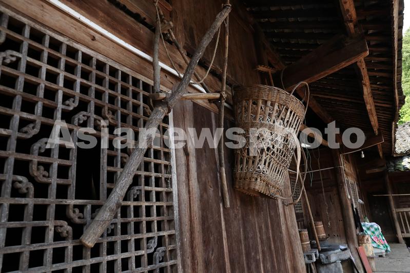 图片说明:2022年7月26日,重庆市黔江区阿蓬江镇青杠村小寨民居板壁上挂着传统的劳作工具。