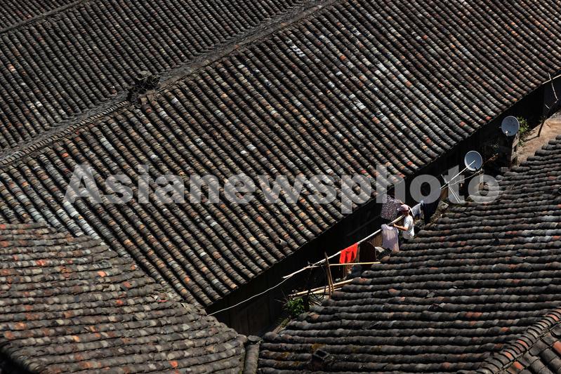 图片说明:2022年7月26日,重庆市黔江区阿蓬江镇青杠村小寨村民谢庆林在晾晒衣服。