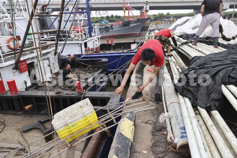 图片说明:2022年7月29日,渔民在江苏省连云港市赣榆区石桥镇木套港往渔船上运送渔具。