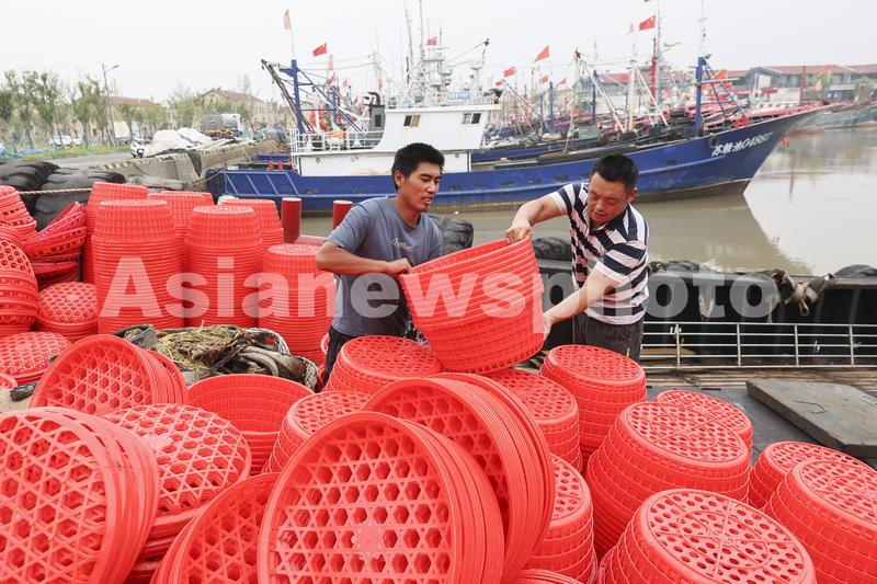图片说明:2022年7月29日,江苏省连云港市赣榆区石桥镇木套港,渔民们在渔船上整理渔具。