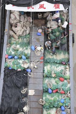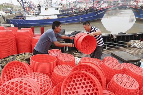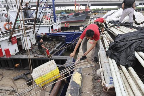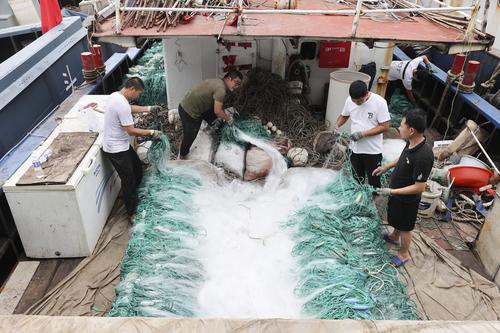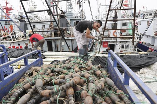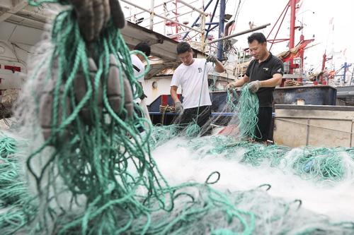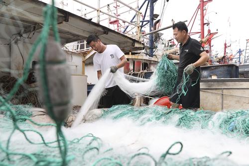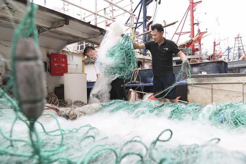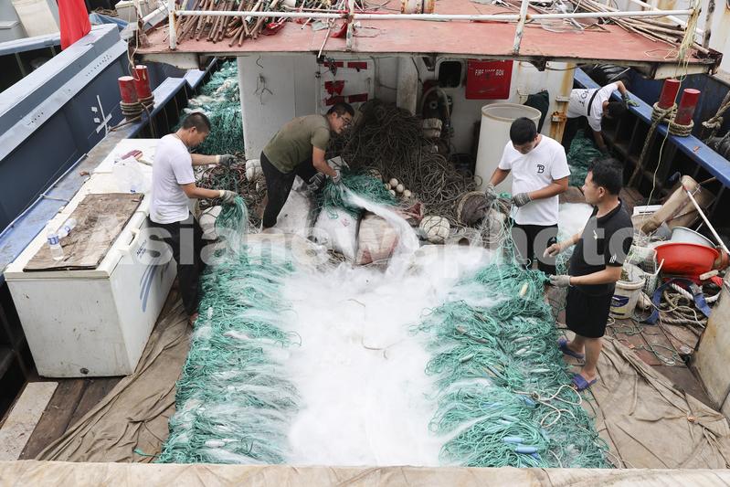 图片说明:2022年7月29日,江苏省连云港市赣榆区石桥镇木套港,渔民们在渔船上整理网具。