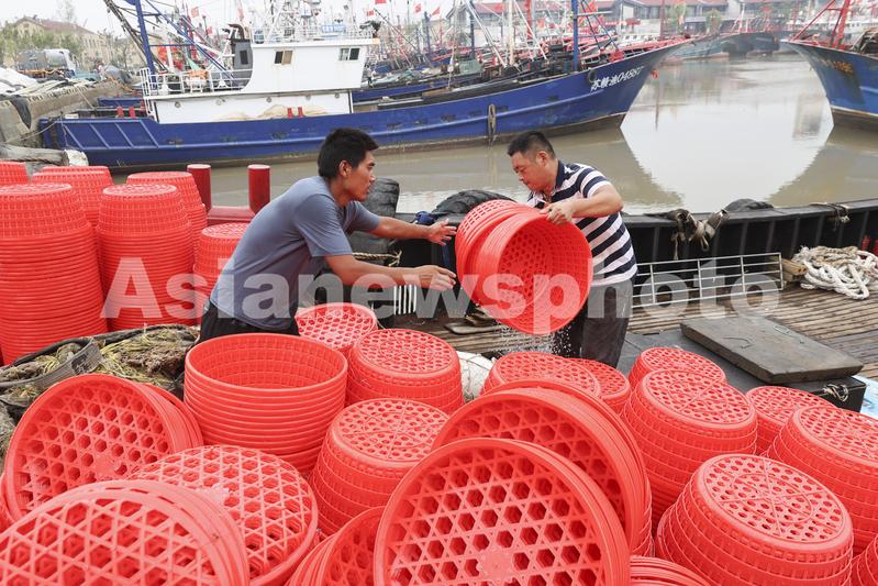 图片说明:2022年7月29日,江苏省连云港市赣榆区石桥镇木套港,渔民们在渔船上整理渔具。
