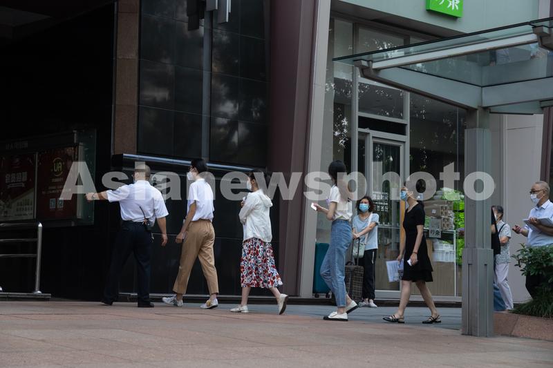 2022年8月1日,美国驻上海总领事馆恢复非移民签证服务,图为人们在美国驻上海总领事馆签证处外排队。