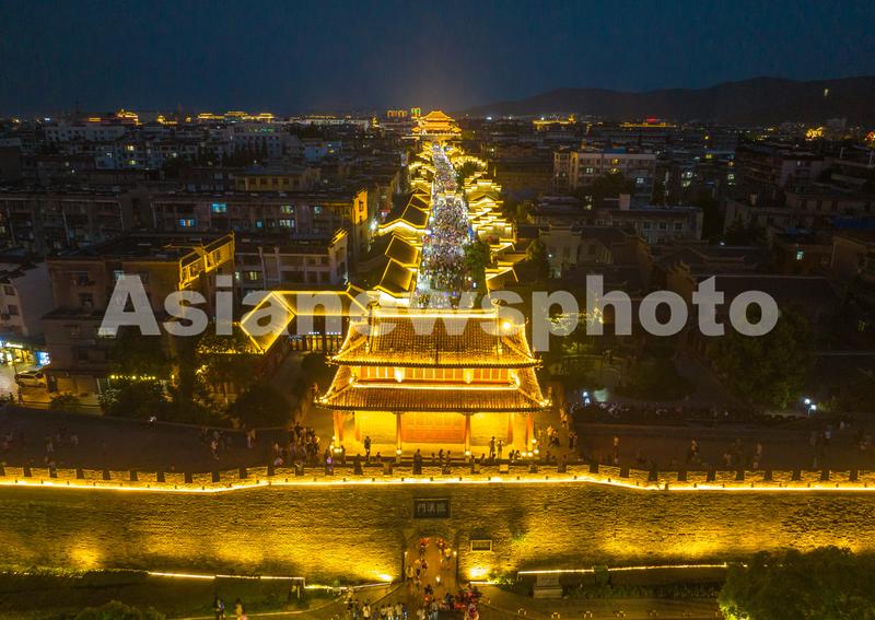 2022年7月30日,随着夜幕降临,湖北省襄阳古城北街和临汉门亮起霓虹灯,吸引了众多市民和游客游玩,欣赏流光溢彩的古城夜景。