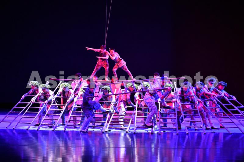 2022年7月31日,江苏省建湖县文化中心,建湖杂技的演员们在舞台表演杂技节目。