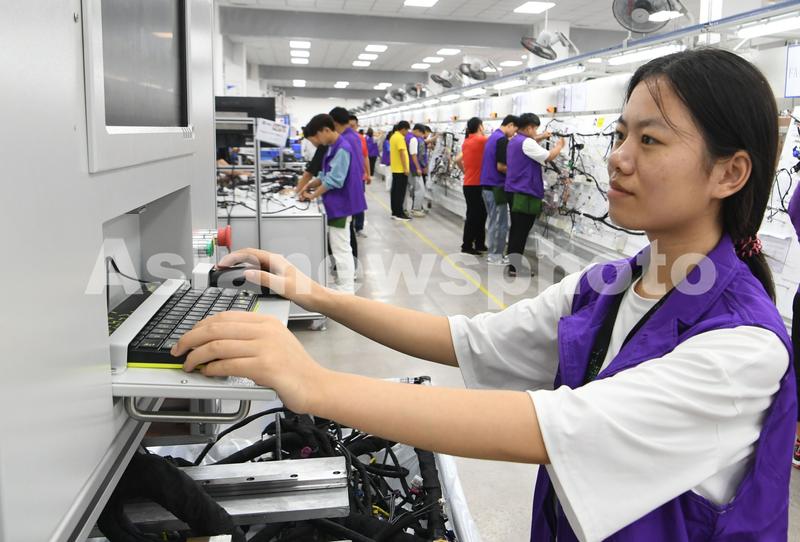 图片说明:2022年7月29日,在安徽省亳州市谯城区经开区立讯精密汽车线束生产车间,工人正忙着生产新能源汽车整车线束。