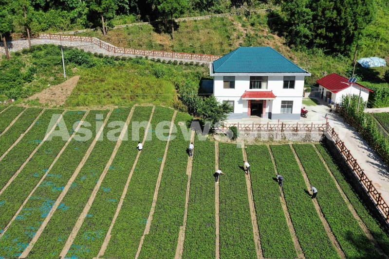 2022年7月29日,在湖北省襄阳市保康县马桥镇堰垭村,村民在中药材苍术育苗基地进行田间管护(无人机照片)。