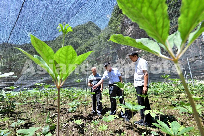2022年7月29日,在湖北省襄阳市保康县马桥镇堰垭村中药材重楼种植基地,村干部和村民查看重楼长势。