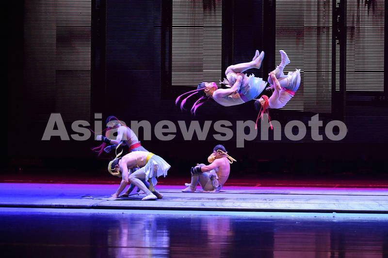 2022年7月31日,江苏省建湖县文化中心,建湖杂技的演员们在舞台表演杂技节目。