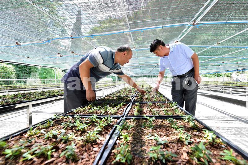 2022年7月29日,在湖北省襄阳市保康县马桥镇堰垭村中药材金钗石斛种植基地,村干部和村民查看金钗石斛长势。