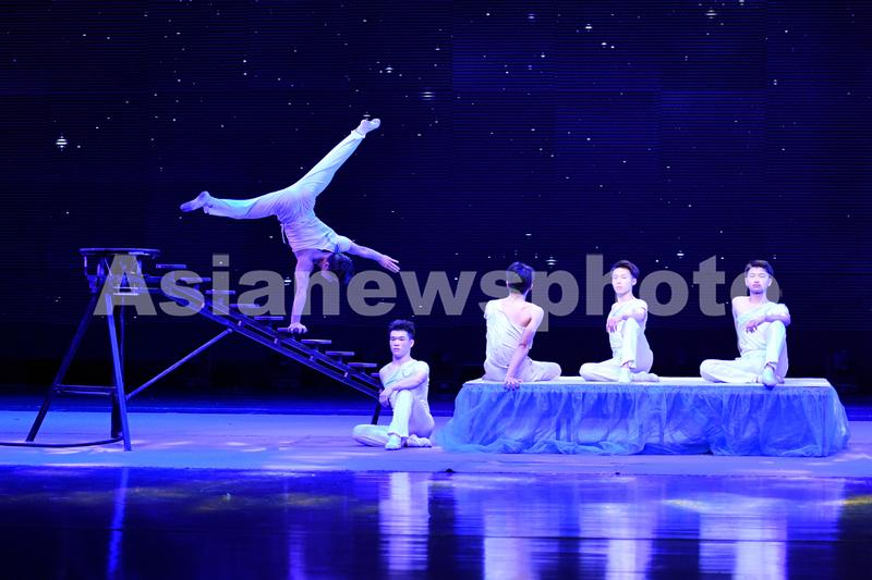 2022年7月31日,江苏省建湖县文化中心,建湖杂技的演员们在舞台表演杂技节目。