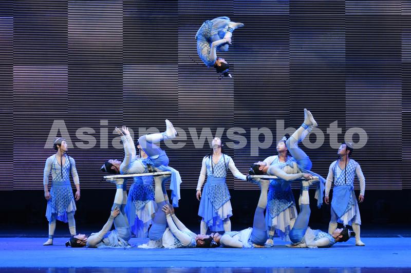 2022年7月31日,江苏省建湖县文化中心,建湖杂技的演员们在舞台表演杂技节目。