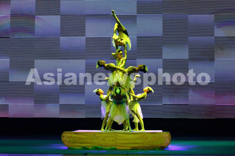 2022年7月31日,江苏省建湖县文化中心,建湖杂技的演员们在舞台表演杂技节目。