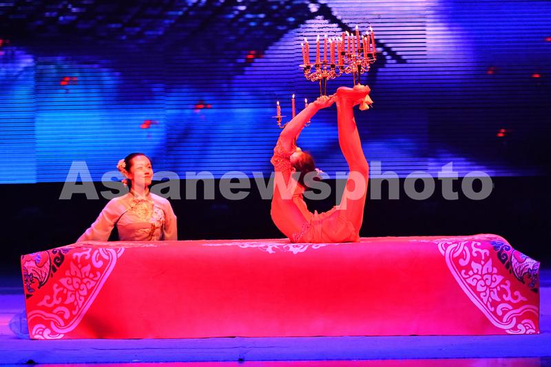 2022年7月31日,江苏省建湖县文化中心,建湖杂技的演员们在舞台表演杂技节目。
