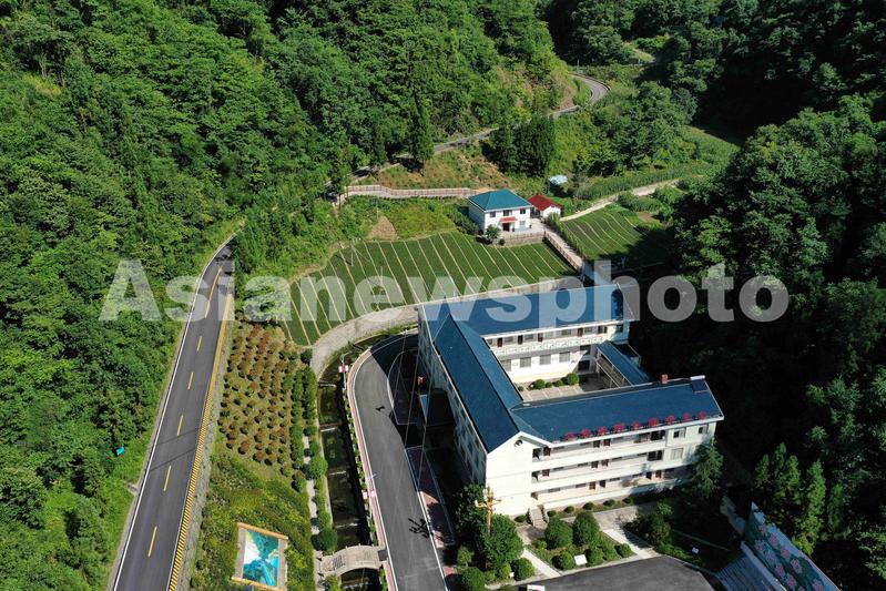 2022年7月29日,拍摄的湖北省襄阳市保康县马桥镇堰垭村党员群众服务中心和中药材苍术育苗基地(无人机照片)。