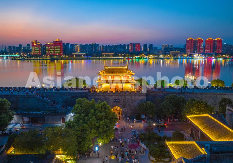 2022年7月30日,随着夜幕降临,湖北省襄阳古城北街和临汉门亮起霓虹灯,吸引了众多市民和游客游玩,欣赏流光溢彩的古城夜景。