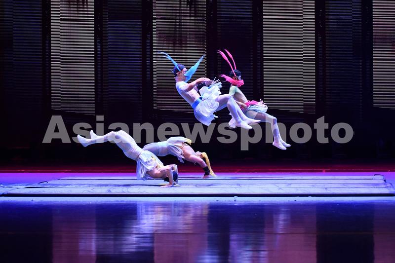 2022年7月31日,江苏省建湖县文化中心,建湖杂技的演员们在舞台表演杂技节目。