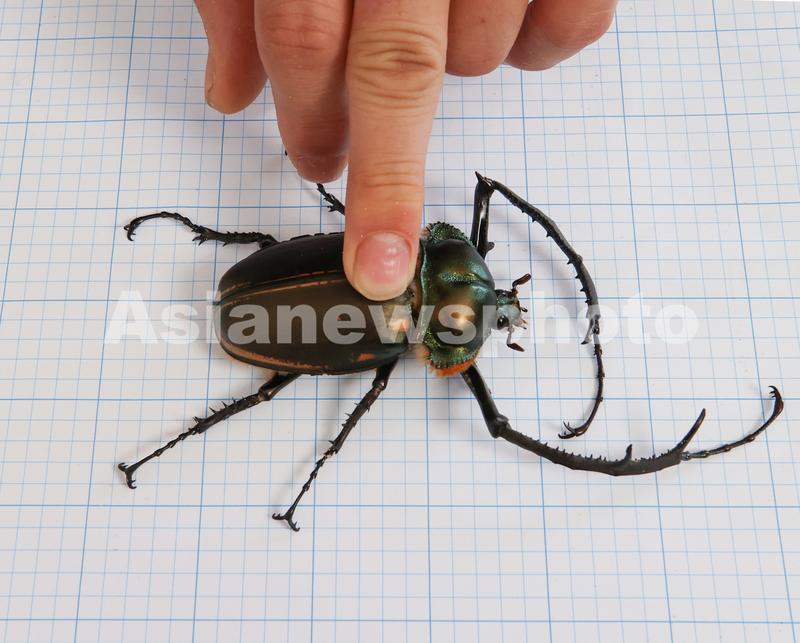 在建瓯市,经实验室测量,雄性阳彩臂金龟生理指标数据:体长73mm,全长173mm;雌性阳彩臂金龟生理指标数据:体长60mm,全长102mm。(7月31日 摄)