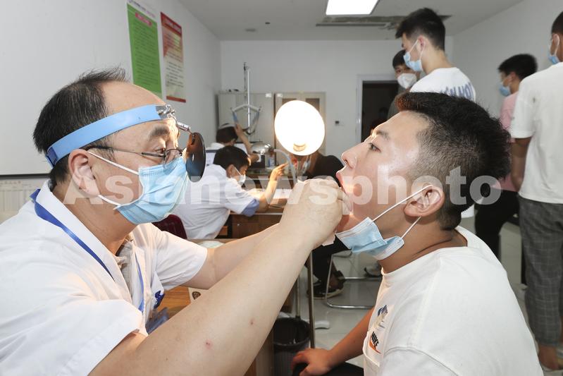 图片说明:2022年8月2日,江苏省连云港市赣榆区应征青年在征兵体检站接受身体检查。