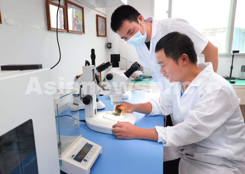 建瓯市科研人员对阳彩臂金龟进行研究。(7月31日 摄)