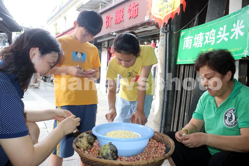 2022年8月1日,游客在江苏苏州葑门横街体验剥“鸡头米”。