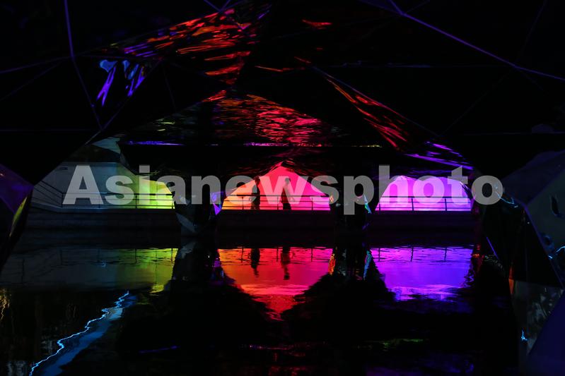 2022年7月9日,市民经过上演光影秀的河边桥洞。