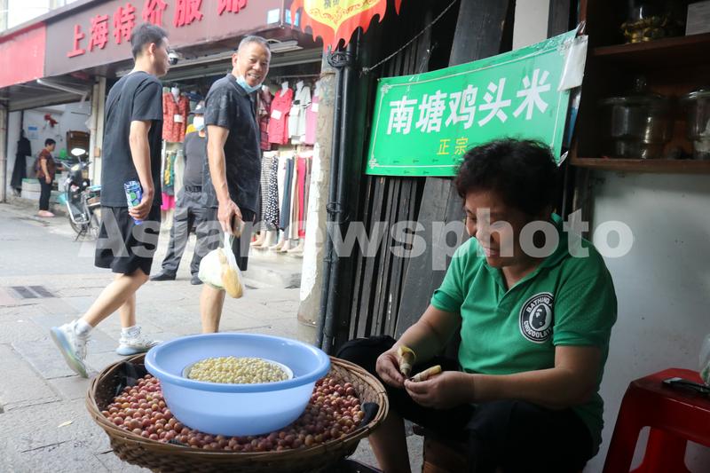 2022年8月1日,商贩在江苏苏州葑门横街现剥现卖新鲜“鸡头米”。