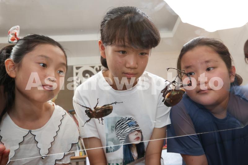 建瓯市第一小学学生黄熠珑(中)、黄睿宸(左一)在观察放归前的阳彩臂金龟。(7月31日 摄)