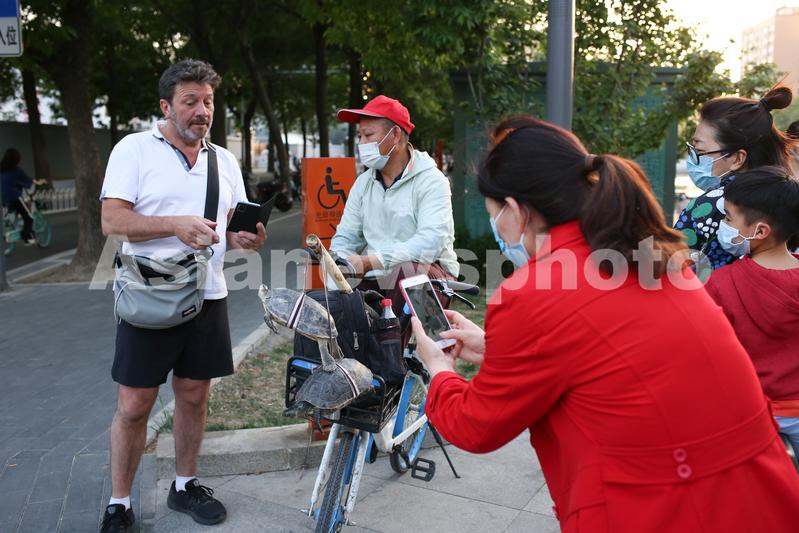 2022年5月3日,亮马河边,围观乌龟的人们。