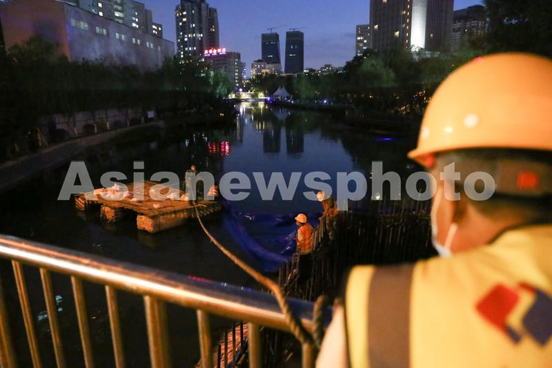 2022年5月16日晚,亮马河沿岸提升改造工程仍在进行中。
