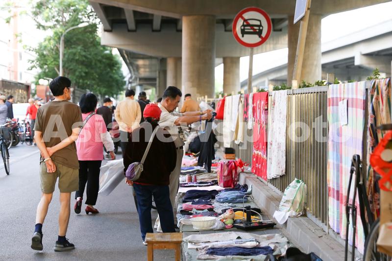 2020年6月6日清晨,亮马河边的早市上,市民在摊位上挑选二手衣服。