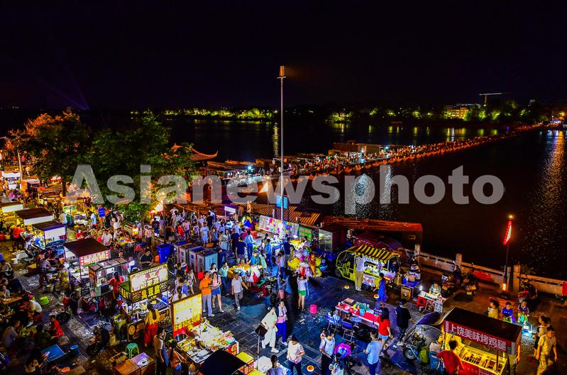 图片说明:2022年8月3日,市民在江西省赣州市章贡区东河浮桥夜市打卡游玩。